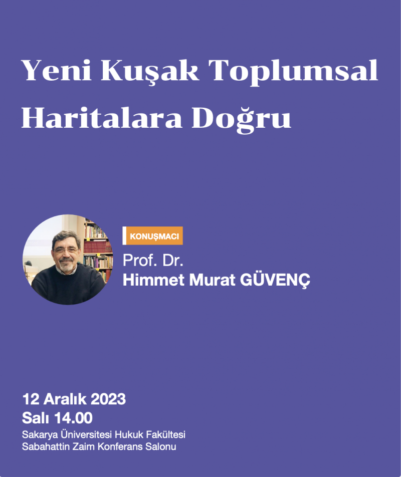 Prof. Dr. Himmet Murat Güvenç tarafından 12 Aralık 2023 Salı günü saat 14:00'da Hukuk Fakültesi Sabahattin Zaim Konferans Salonunda gerçekleştirilecek olan "Yeni Kuşak Toplumsal Haritalara Doğru" konferansına bütün öğrencilerimiz ve ünivesite personeli davetlidir.